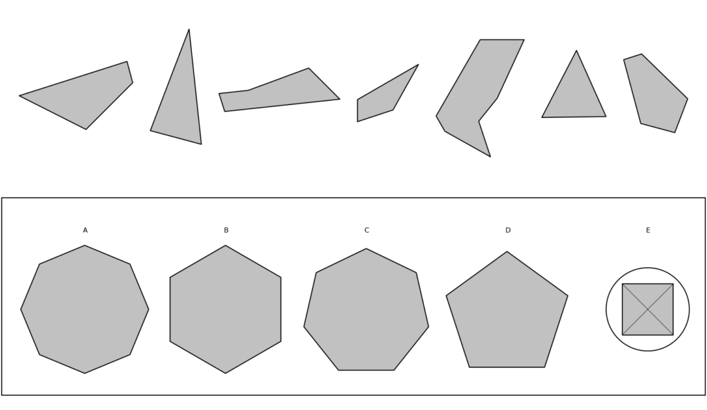 Unsere Übungen, die wir basierend auf dem Testniveau erstellt haben, lassen sich in zwei Kategorien einteilen: Polygone und Kreisfiguren. Viele Jahre standen ausschließlich fünf- bis achteckige Polygone und Viertelkreise als richtige Lösungsoption am Testtag zur Auswahl.