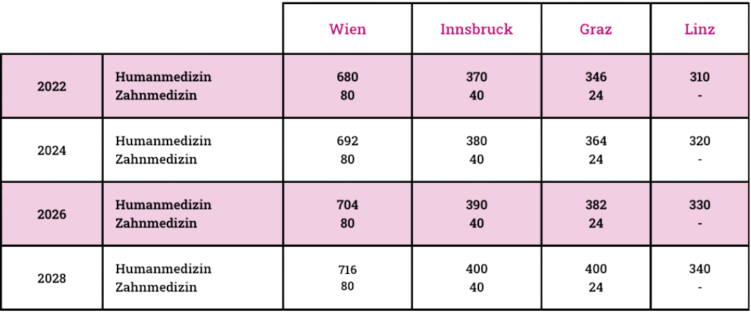 Im Jahr 2025 standen, wie schon 2024, insgesamt 1.900 Studienplätze für Humanmedizin und Zahnmedizin zur Verfügung. In den letzten Jahren konnte man die Entwicklung der Medizinstudienplätze stets den Mitteilungsblättern zur Weiterentwicklung der MedUnis in Österreich entnehmen. Prognostisch werden sich die Medizinstudienplätze in Österreich bis 2028 weiter erhöhen. Genaue Zahlen dazu werden allerdings erst veröffentlicht. Weitere Informationen zu den Studienplätzen für das Medizinstudium in Österreich findest du hier.