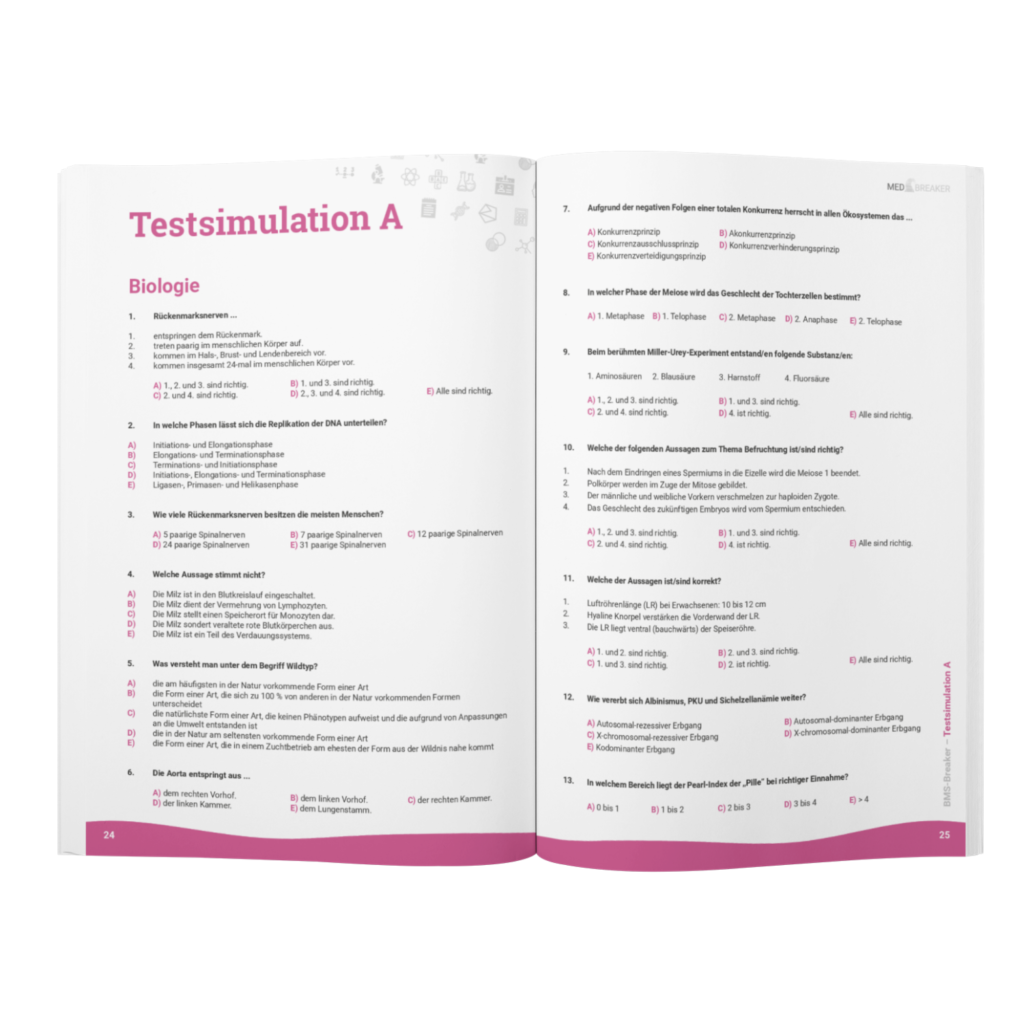 Was haben die vier Fächer Biologie, Chemie, Physik und Mathematik gemeinsam? Sie alle bilden das Fundament deiner medizinischen Ausbildung im österreichischen Medizin-Aufnahmetest. Angefangen von den biochemischen Vorgängen in unserem Körper, über die Funktionsweise des EKGs kann man durchaus behaupten, dass es ohne jegliches Verständnis für diese Grundbausteine im späteren Berufsleben schwer wird. Da trifft es sich gut, dass der MedAT so konzipiert wurde, dass diesen Fächern eine zentrale Rolle zukommt. Der BMS-Breaker mit mehr als 1.300 Übungen und MedAT HERO (Lernskript) stellen genau diesen naturwissenschaftlichen Teil in den Mittelpunkt. Für Textverständnis und die soziale-emotionalen Kompetenzen ist der SEK-TV-Breaker empfehlenswert. Für alle anderen Teilbereiche des Aufnahmetests empfiehlt sich unser Hauptbuch, der MED-Breaker. Alle MedAT Bücher befinden sich im MEDBREAKER | MedAT-Erfolgspaket. In unserem MedAT-Buch enthalten sind: