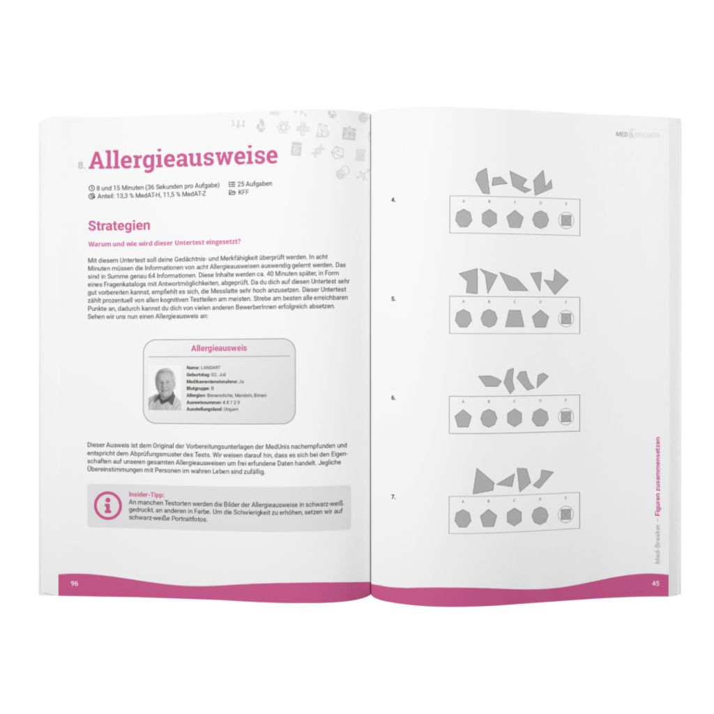 Der MED-Breaker ist das Übungs- und Strategiebuch für den MedAT, den österreichischen Medizin-Aufnahmetest. Mit Stolz können wir sagen, dass unsere Bücher zahlreichen Studienwerbenden zu einem Studienplatz verhalfen. Diese Auflage unseres Leitfadens enthält mehr als 5.000 Übungen (inkl. 1.000 E-Learning-Figuren). Diese bieten ein reichhaltiges Übungsangebot für eine optimale Vorbereitung. Testteilnehmende, die beim MedAT Platz 1 und Platz 2 erreichen konnten, geben Tipps und präsentieren ihre persönlichen Lernpläne. Für die Vorbereitung auf den BMS empfiehlt sich der BMS-Breaker und MedAT HERO. Für das Textverständnis und die sozial-emotionalen Kompetenzen empfiehlt sich der SEK-TV-Breaker. Alle Bücher befinden sich im MEDBREAKER | MedAT-Erfolgspaket. In unserem MedAT-Buch enthalten sind: